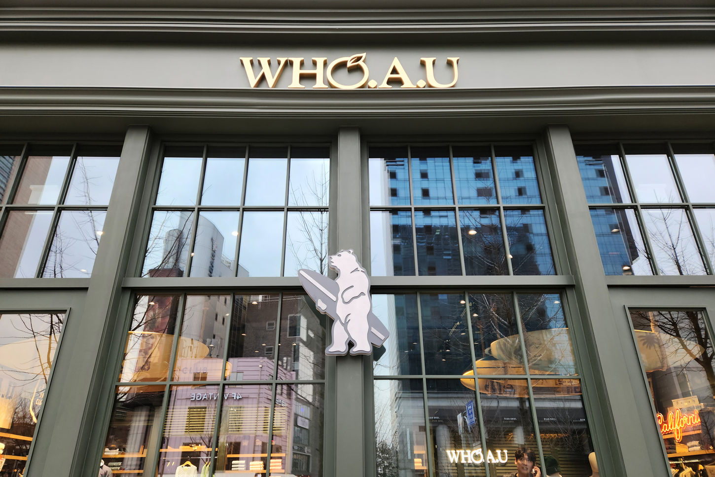 The WHO.A.U Hongdae store brand signage project was developed to secure both brand character and legibility within a trendy urban commercial district.